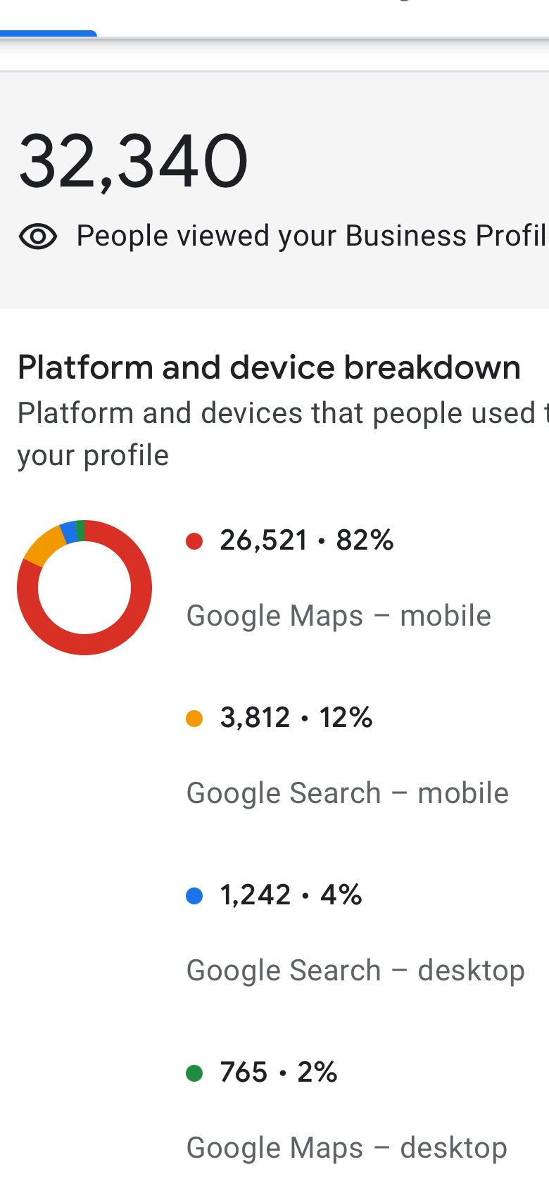 The stats show that out of 32,000 views, 94% of people viewed the Business Profile from their phone (82% from the Google Maps app and 12% from Google Search) and just 6% viewed the Business Profile from their laptop or desktop.