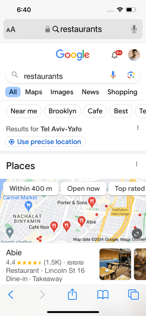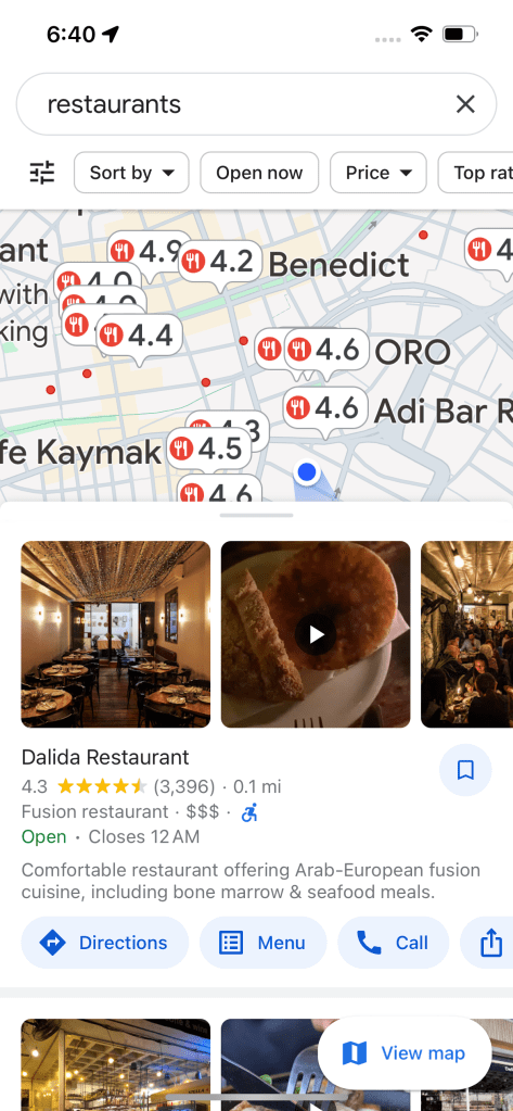 Another search that shows Google Maps in Google Search: “restaurants”.