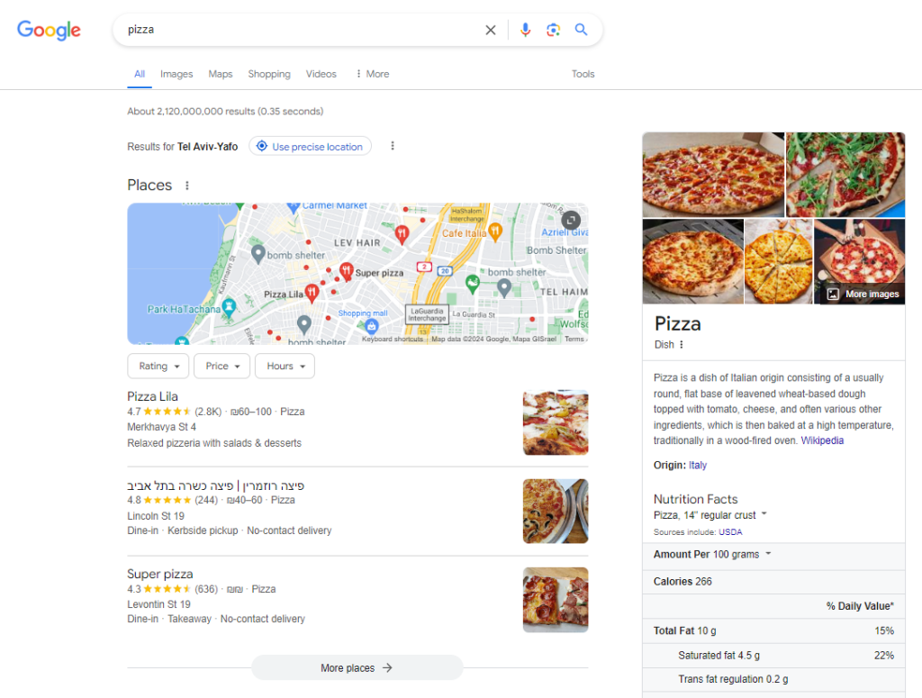 A search that shows Google Maps in Google Search: “pizza”.