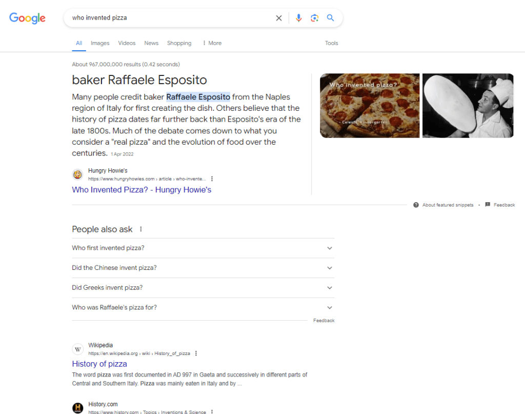 A search that doesn’t show Google Maps in Google Search: “Who invented pizza”.