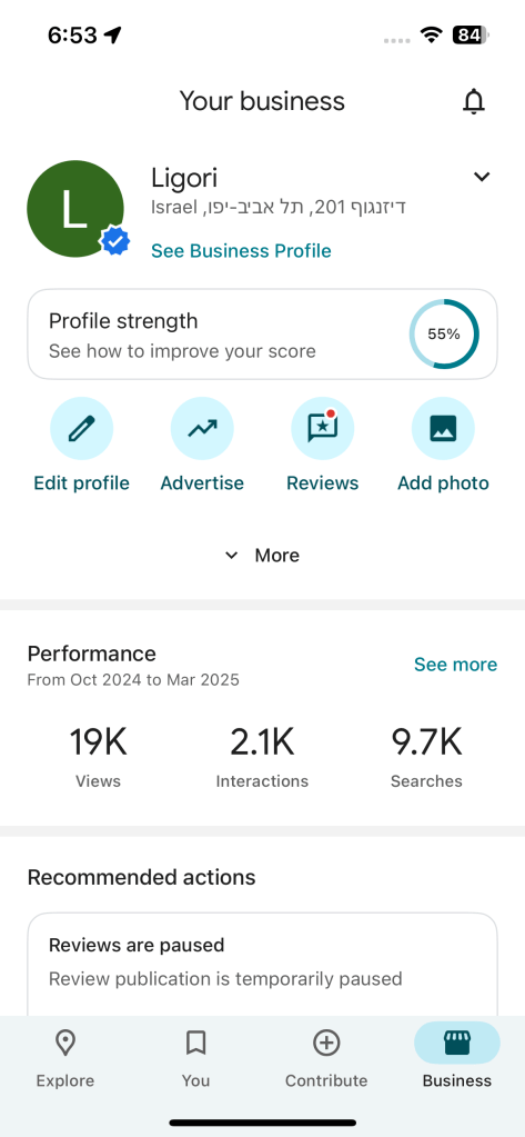 Open the Google Maps app, check that you’re signed into the Google profile that manages your Google Maps page, tap the Business button at the bottom right of your screen, and then tap Edit profile.