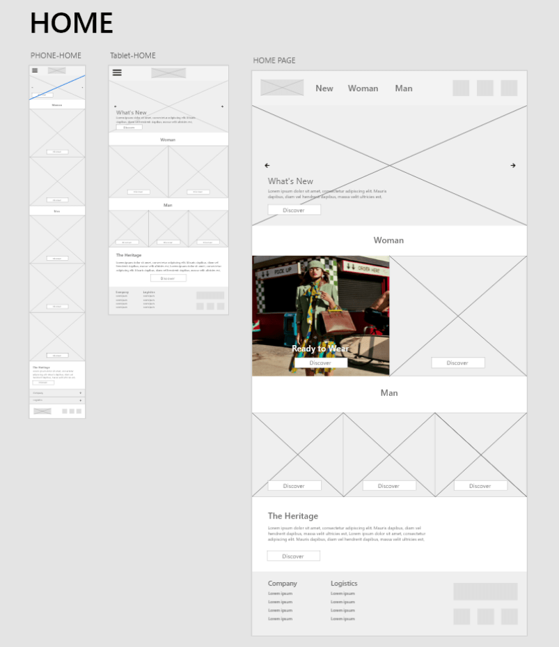 Below are lo-fidelity wireframe iterations for the Home page, for both Mobile, Tablet and Desktop view.