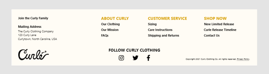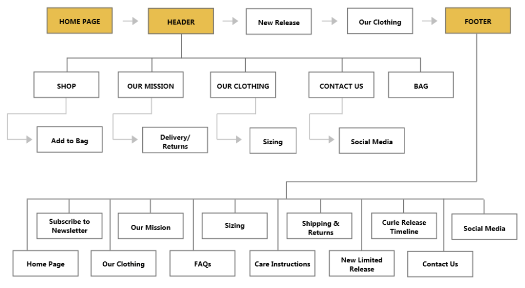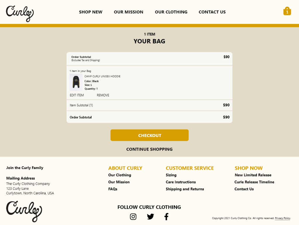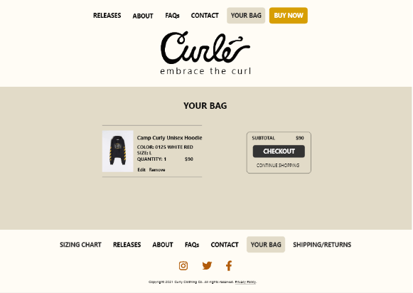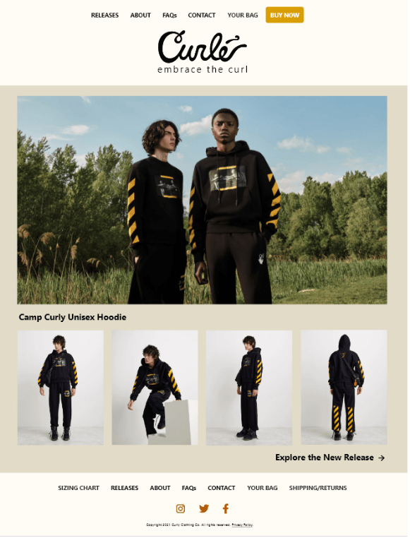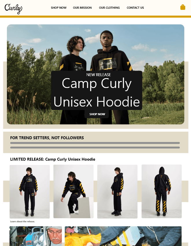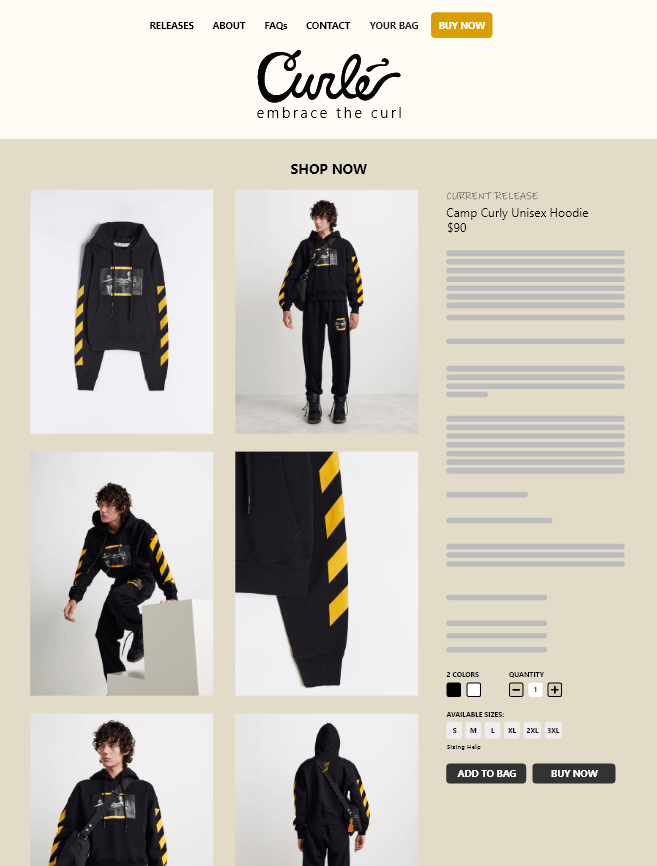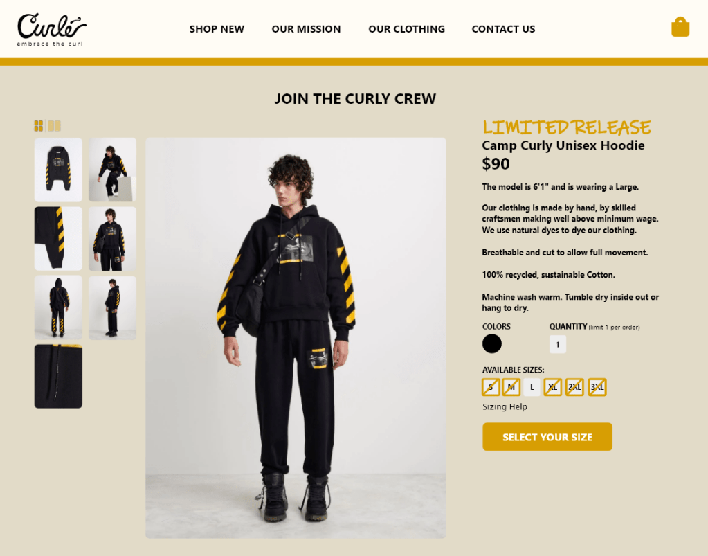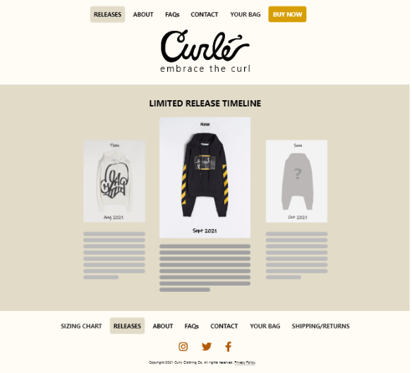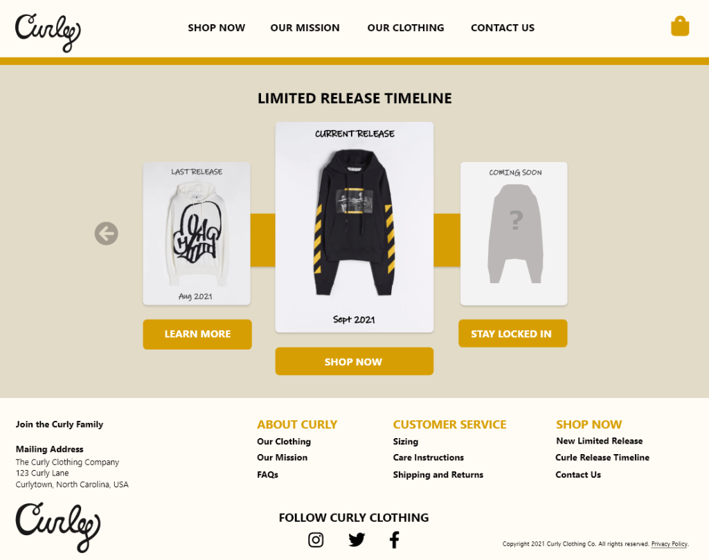 Curle Clothing Company is a new clothing brand concept that needs a website to sell their clothing. They are a brand that releases clothing in limited quantities, so they don’t need the traditional clothing website features like clothing categories and a mega-navigation with many links.