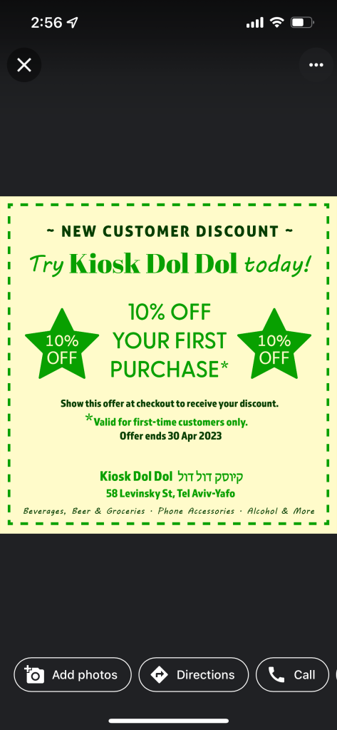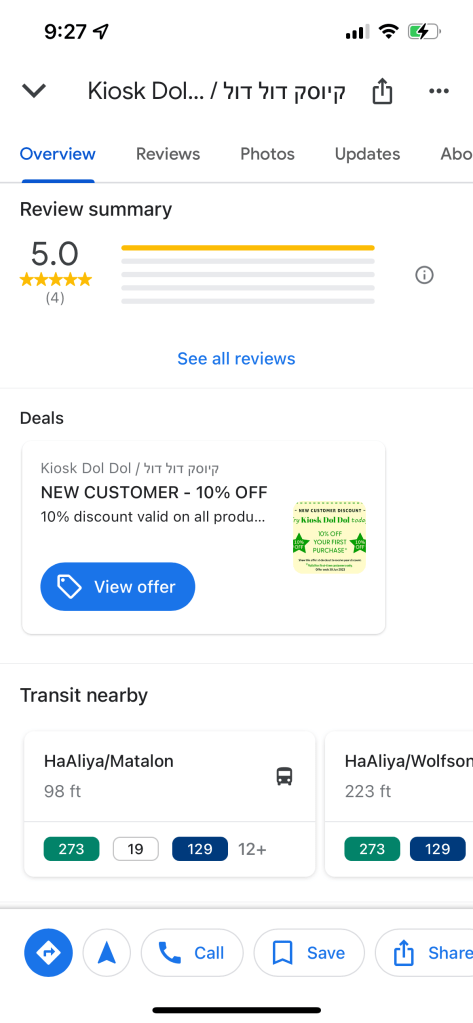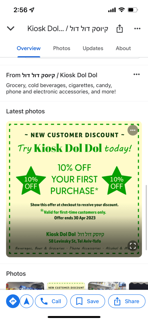 Below are screenshots of how the coupon looked on mobile, from both the Google page’s Overview tab and the Photo section.