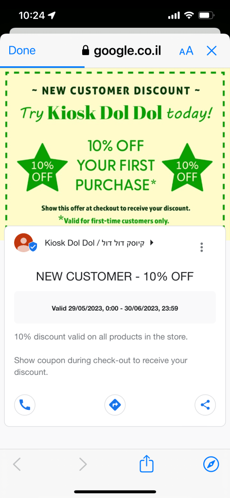 I then taught the business owner how to post an Offer on Google, and together we uploaded the coupon as an Offer titled “NEW CUSTOMER – 10% OFF”. The coupon was valid for 1 month.