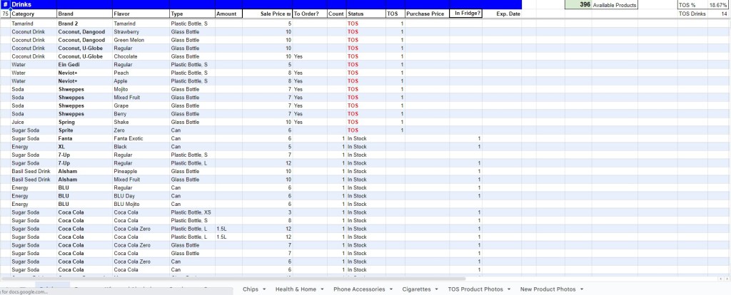 I created an inventory of the kiosk’s products to make it easier to create product and price labels. The business owner can also use this inventory to add new products, mark products as TOS (temporarily out of stock) and track expiration dates of grocery products.